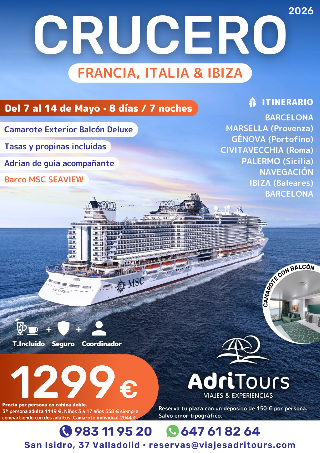 - Itinerario:BARCELONA, MARSELLA, LIVORNO (Florencia/Pisa), CAGLIARI (Cerdeña), PALERMO (Sicilia), VALETA (Malta), NAVEGACIÓN, BARCELONA.